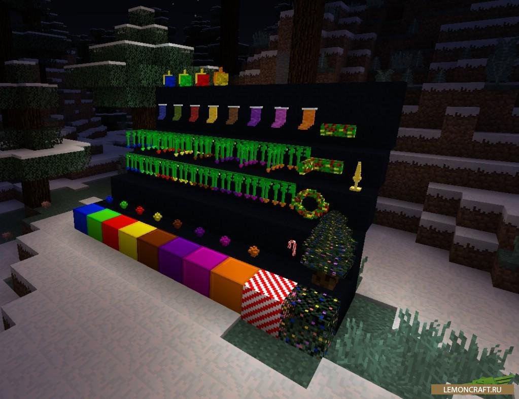 Мод Christmas Festivities принесет в игру майнкрафт атмосферу рождества. Появятся новогодние угощения, на деревьях будут развешаны игрушки. Сладкие палочки, полосатые, можно использовать в качестве топлива.