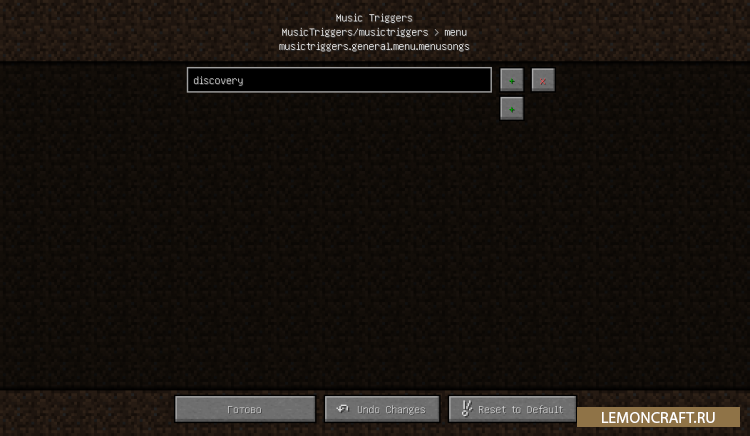 Для проигрывания музыки вам нужно положить свой музыкальный файл в формате ogg в папку config/MusicTriggers/songs/assets/musictriggers/sounds/music. После этого заходите в меню мода и указываете путь к нужному файлу для нужного триггера.